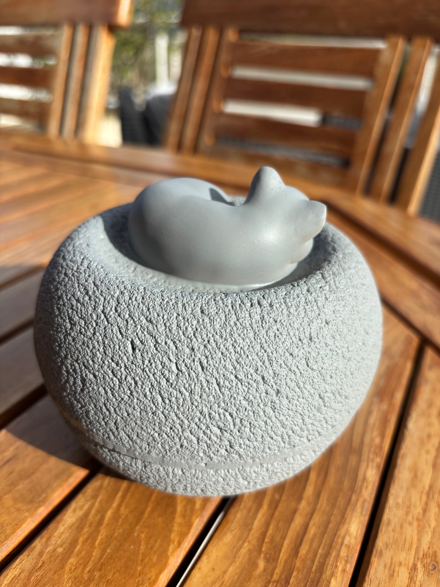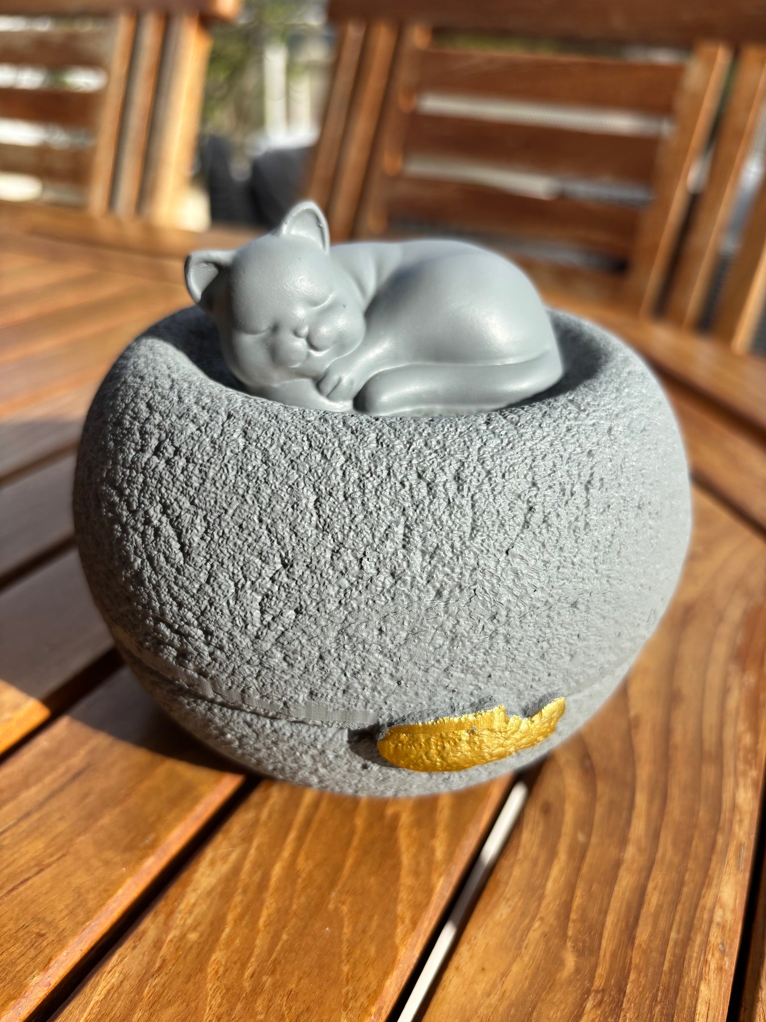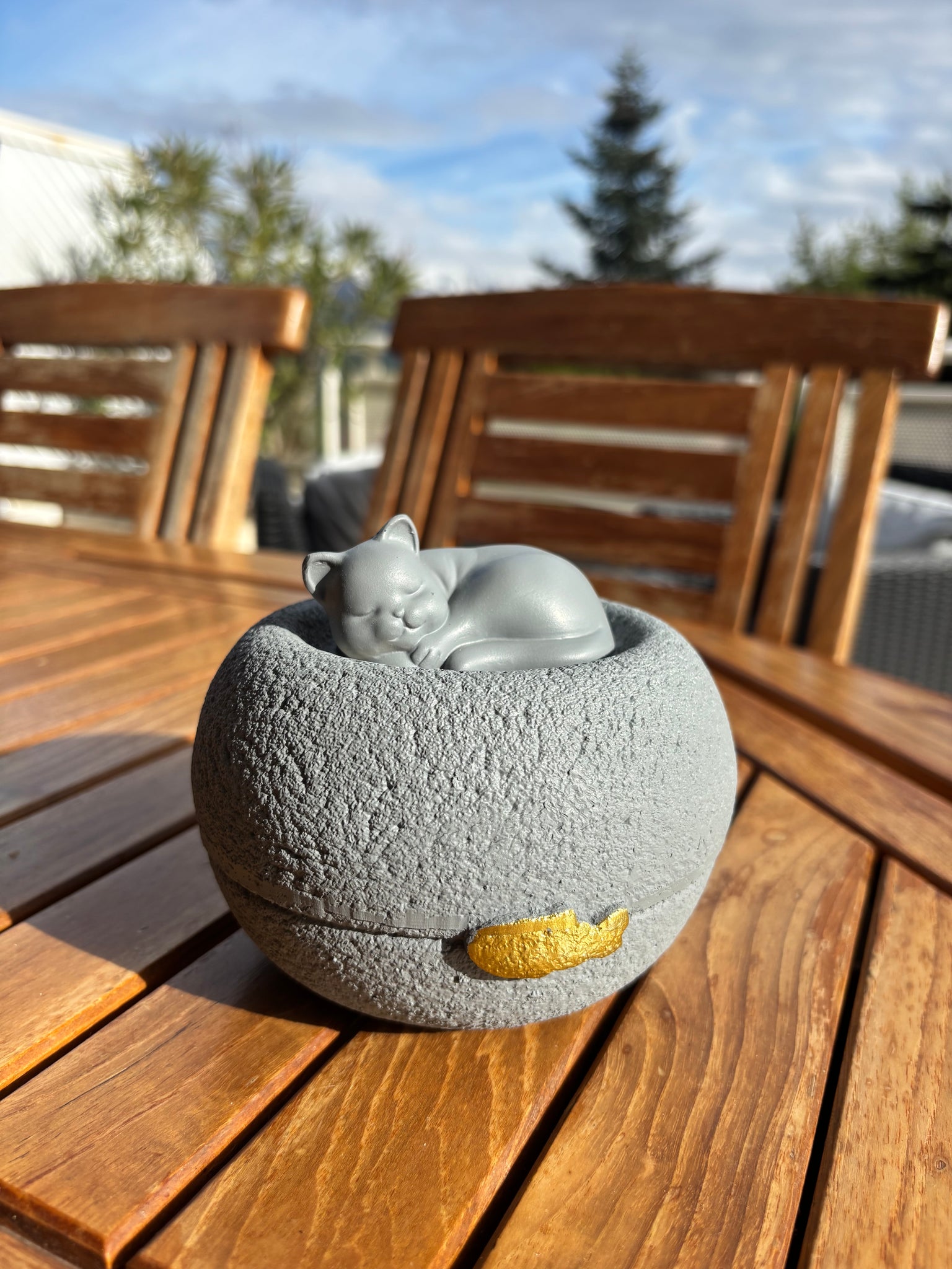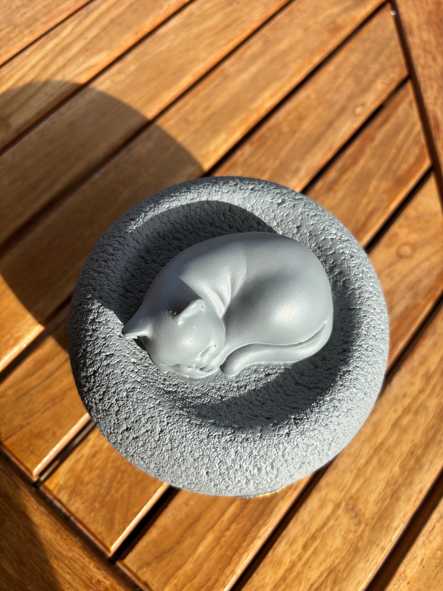De couleur grise, cette urne funéraire est réalisée à partir de résine et conçue en forme de chat. Cette Urne cinéraire est sans doute un produit idéal pour rendre hommage à votre chat disparu. Cette urne pour chat a une ouverture sécurisée par le bas avec un couvercle fileté. Un patin en feutre termine cette urne funéraire pour la rendre antidérapante. Il est possible de mettre à l'intérieur les cendres après une crémation. On peut également y déposer un collier.